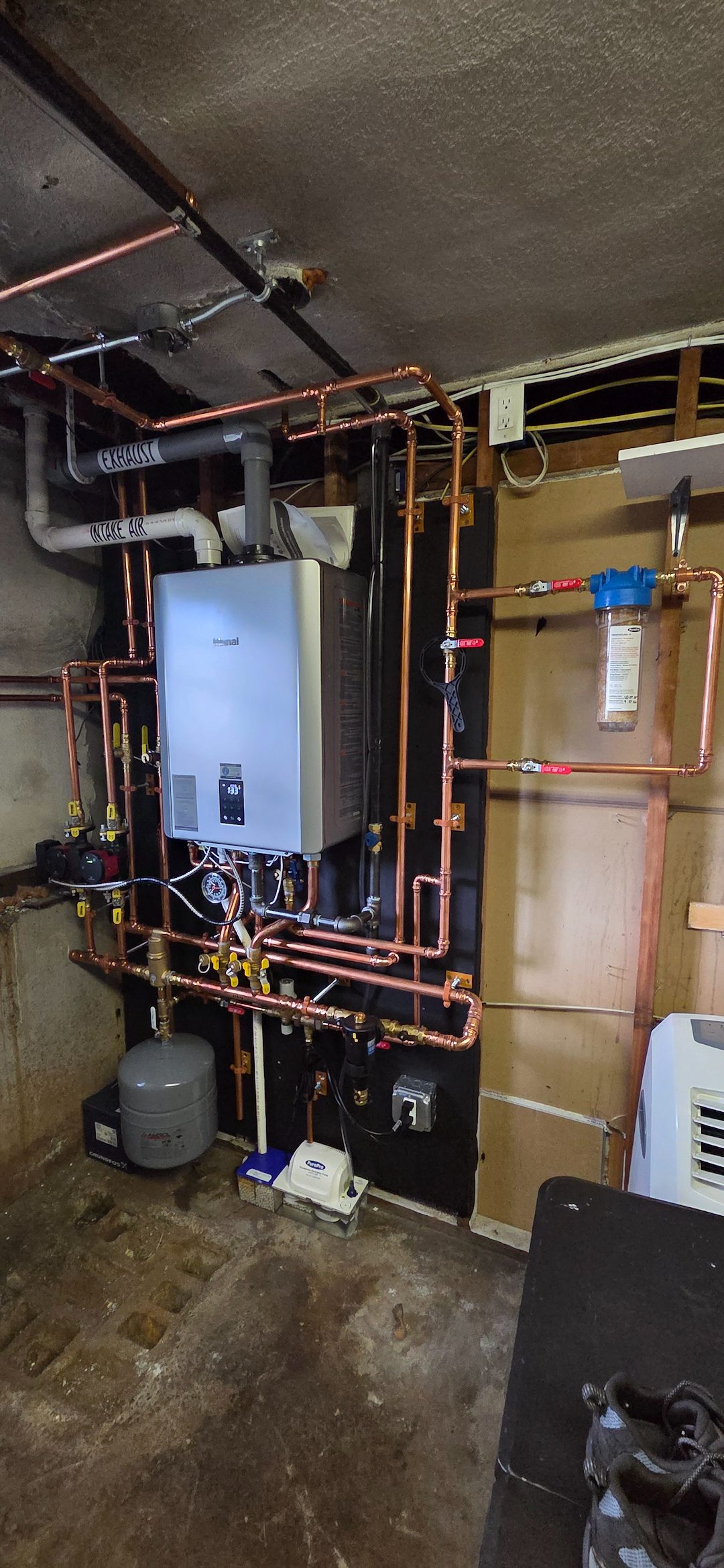 Completed the installation of a Rinnai propane-fired combination boiler, removing two older systems and combining them into one modern, high-efficiency unit. This preventative upgrade increases performance, lowers fuel consumption, and simplifies the mechanical system for long-term reliability.
